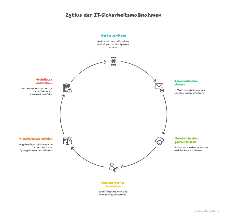 - Maßnahmen definieren: Zugriffskontrolle, Backup, Schulung, sichere Übertragung.